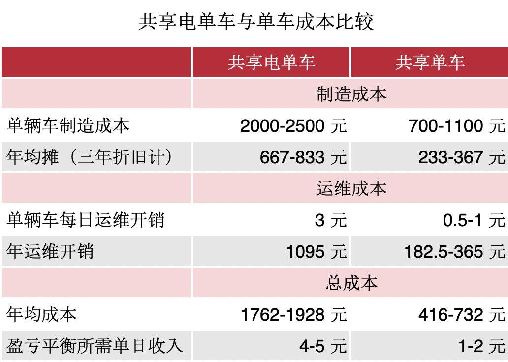 根据《晚点 LatePost》从行业内公司获得的内部数据,若将生产和运维成本以三年折旧平摊计算,共享电单车成本每年约为共享单车的 2-4 倍。