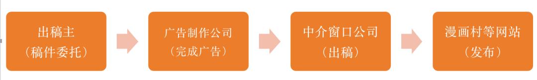 在这一过程中,出稿主将自己的商品广告委托和广告费发送给广告制作公司,广告制作商根据委托和广告费制作相关广告,并发送给中介商。中介商通常同时负责多个广告公司与多个网站的联系。中介将成品广告发送给“漫画村”,而“漫画村”将广告登载在网站上开始计费。