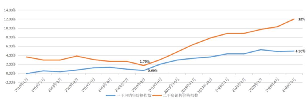 表:2019年1月-2020年5月深圳一、二手房销售价格指数同比涨幅