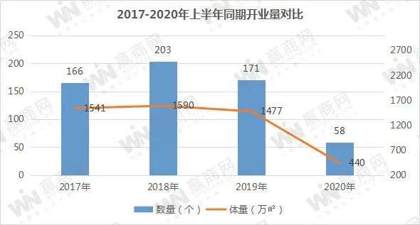 据赢商大数据统计,2020年上半年(1-6月)全国开业购物中心共58个,体量合计440万平方米,为2017年以来新低,仅相当于前两年1月份的开业量,与2019年同期相比,约为三成。
