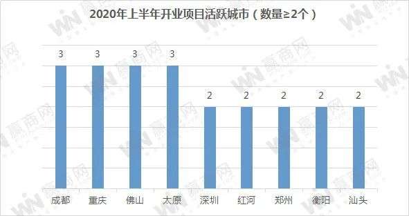 从开业项目较为活跃的城市看,开业量≥2个的城市共9个,其中5个为二线城市,成都、佛山、重庆、太原开业量均为3个。值得注意的是,云南红河、湖南衡阳、广东汕头、江苏徐州等下沉城市赫然入列,与深圳并肩。