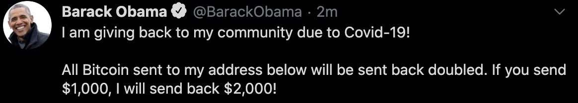 “因为新冠病毒肆虐,我现在要回馈社区。所有给我下方账户打进比特币的人,我将双倍回报你。如果你打进来 1000 元,我会回报你 2000 元。”