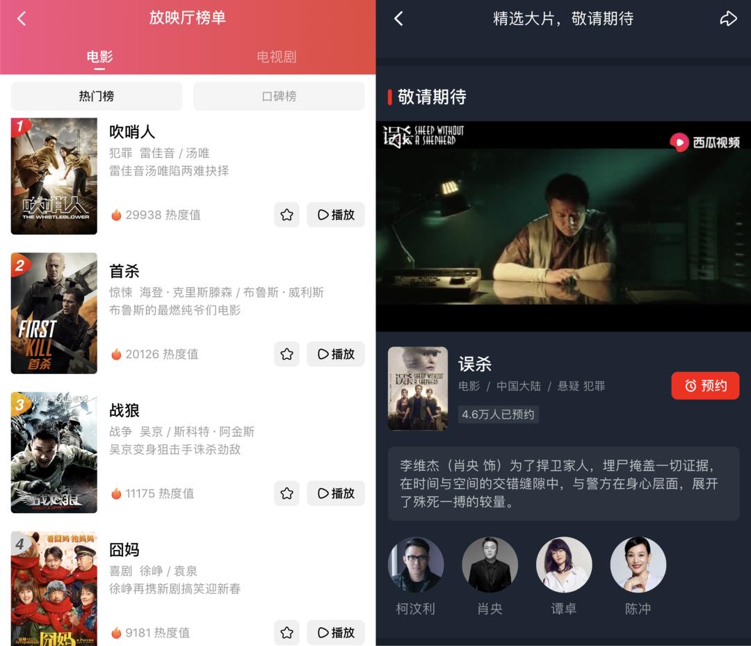 目前来看,之前在欢喜首映会员独享的《疯狂的外星人》、《吹哨人》皆可在西瓜视频免费观看,热度相当不错。而站内页面显示,《两只老虎》、《南方车站的聚会》、《误杀》等影片也即将上线。