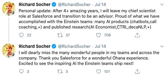 但不巧的是,负责爱因斯坦平台的首席科学家Richard Socher 就在前天宣布,他将离开Salesforce,自己创业。