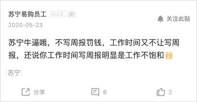 不写周报要交钱的也不止京东一家。苏宁也是这样,不写周报要罚钱,还不让在工作时间写周报。