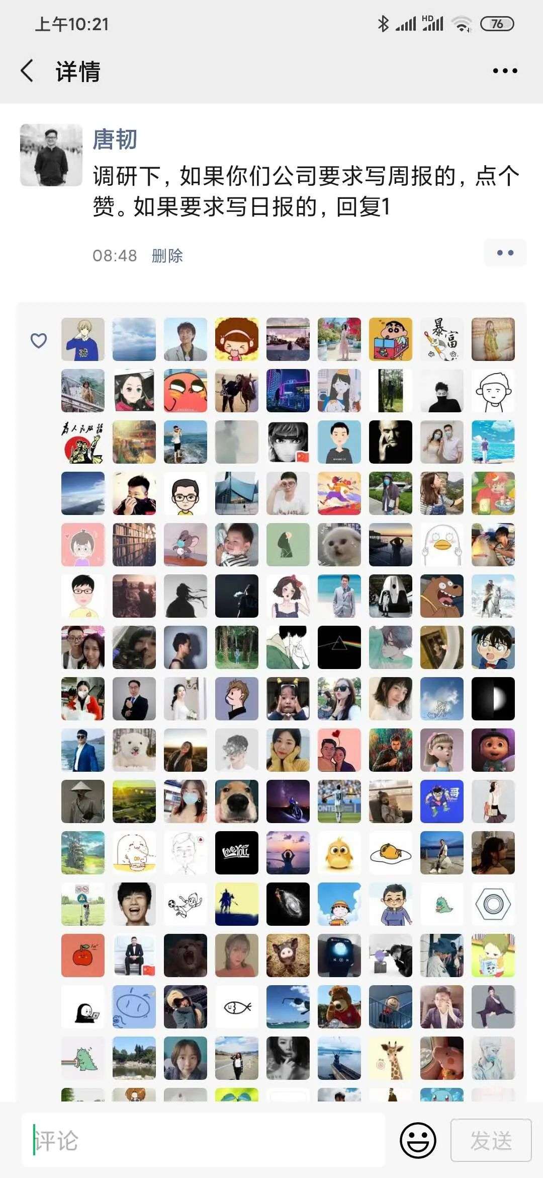 早上我在两个微信分别发了个朋友圈,想调研下圈里要求写周报以及日报的大概是个什么比例。