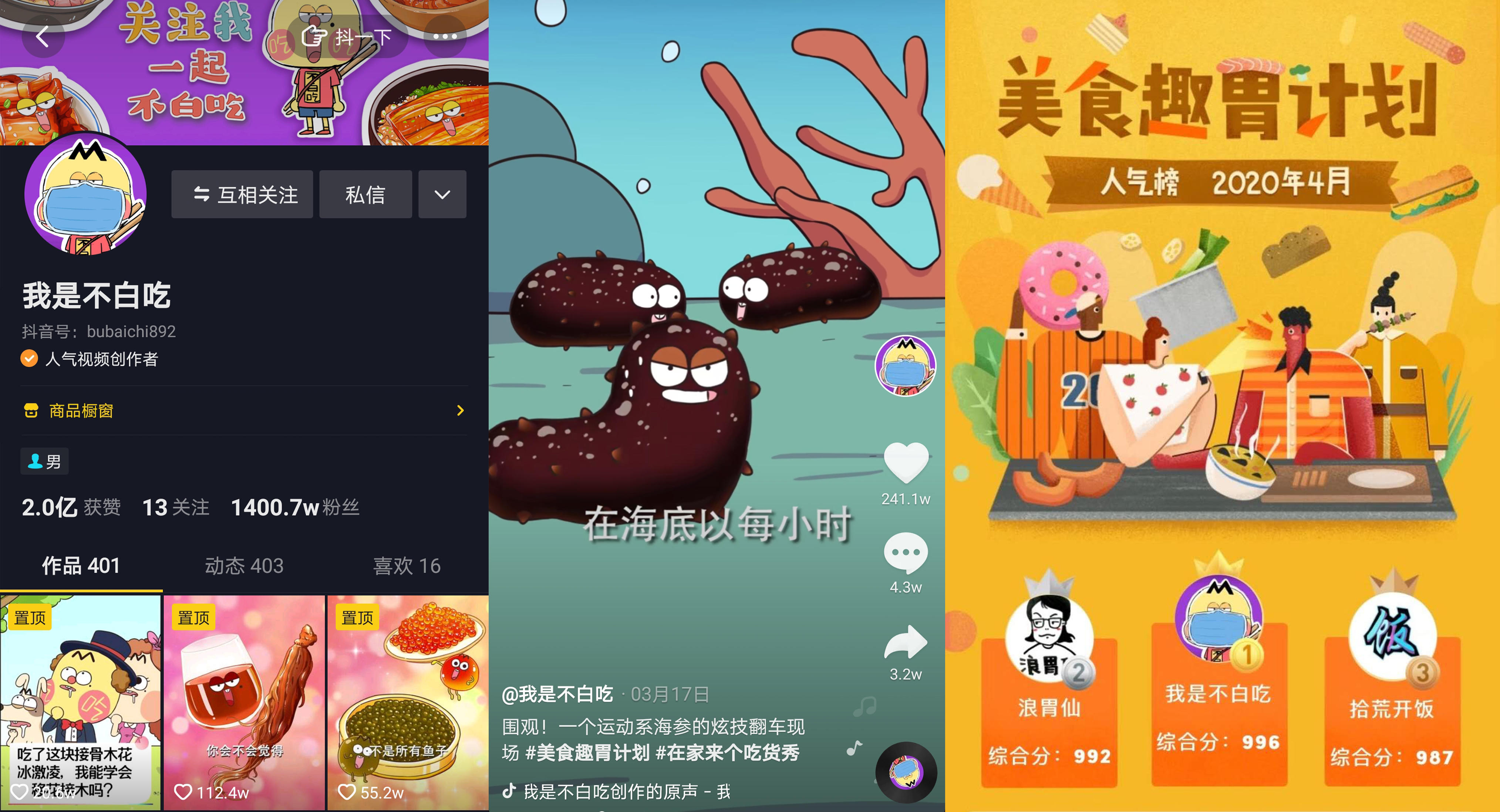 调动了全公司 15 个人,重力聿画在确立了「我是不白吃」这一吃货IP后,一周内做出了 50 集内容。第一集「油条」主题的动画视频上线后,播放量达到了 400 万,点赞 20 万。2个月之后,「我是不白吃」的抖音粉丝达到了 100 万,快手 50 万。