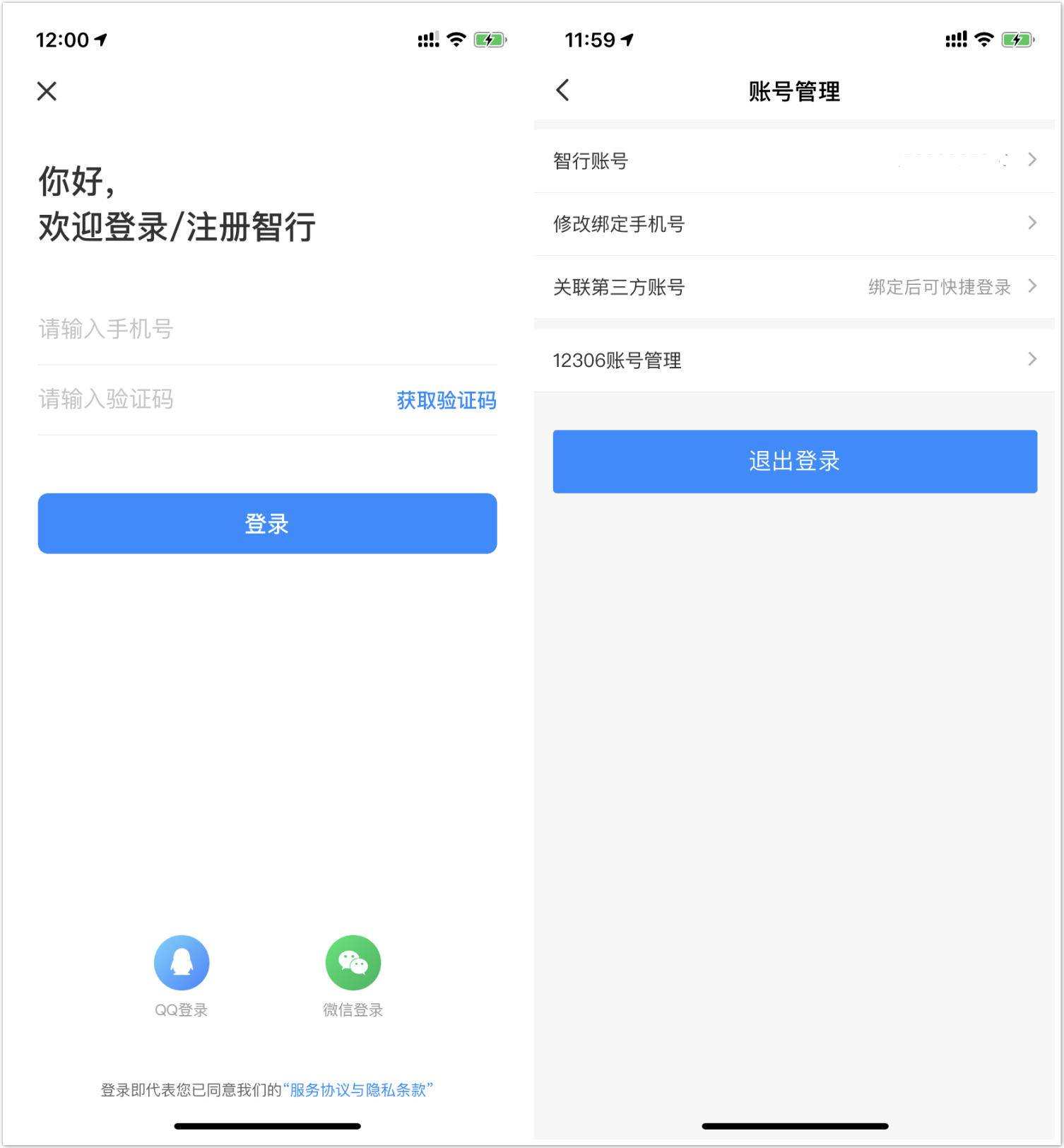 智行火车票注册/登录界面、登录后的账号绑定界面