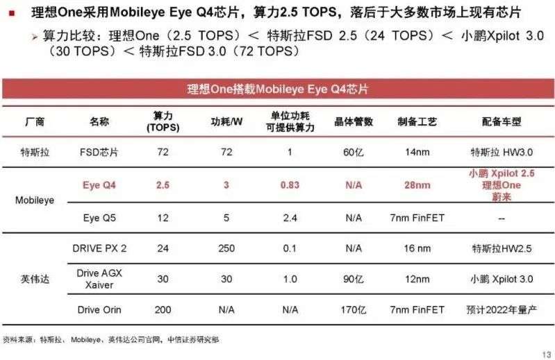 因此,理想ONE的芯片算力为2.5TOPS,这种算力水平在市场现有芯片中处于“垫底”位置——据中信证券数据进一步显示,目前新能源汽车的算力排序为:理想ONE(2.5TOPS)<特斯拉FSD2.5(24TOPS)。