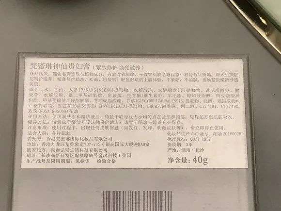 从梵蜜琳在国家药品监督管理局的化妆品备案的成分信息发现,神仙贵妇膏的主要成分为水、甘油、人参提取物、水解珍珠、水解胎盘(羊)提取物、角鲨烷。该产品实际在国产非特殊用途化妆品备案中还有"DMDM 乙内酰脲","丙二醇","CI 77491","CI 77492","玫瑰(ROSA RUGOSA)花油等成分。