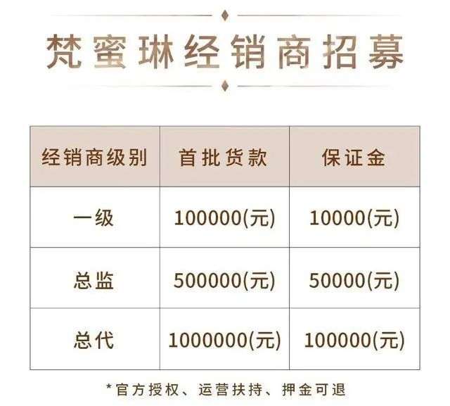 上述梅珊珊所说的代理等级以及门槛,在另一个梵蜜琳总代那里又换了一个说法。自称“梵蜜琳国际护肤总代”的美美表示,梵蜜琳现在只招总监以上的级别,虽然对学历没有要求,但需要交纳10万元保证金和50万元首批货款,这与梅珊珊提到的总监级别代理门槛相差5万元保证金。