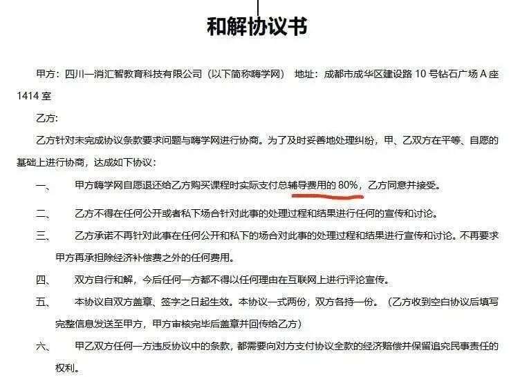 在燃财经加入的一个嗨学网微信维权群中,一位消费者表示,在多次拨打维权电话甚至报警后,最终拿到了80%的退款,与此同时,收到了嗨学网发来的一封和解协议书。该协议书中,明确表示只退费80%,并且标注一项条款:乙方不得在任何公开或者私下场合针对此事的处理过程和结果进行任何的宣扬和讨论。