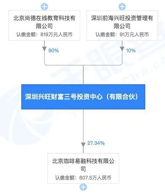 据天眼查显示,北京咖啡易融科技有限公司的第二大股东,为深圳兴旺财富三号投资中心,认缴金额为607.5万人民币,持股27.34%,而该公司是由北京尚德在线教育科技有限公司控股。另外,值得关注的是,嗨学网是由尚德机构内部孵化的项目,尚德机构先后在嗨学网的天使轮和C轮进行了注资。由此可见,这三家公司之间的确存在着一定的利益挂钩。