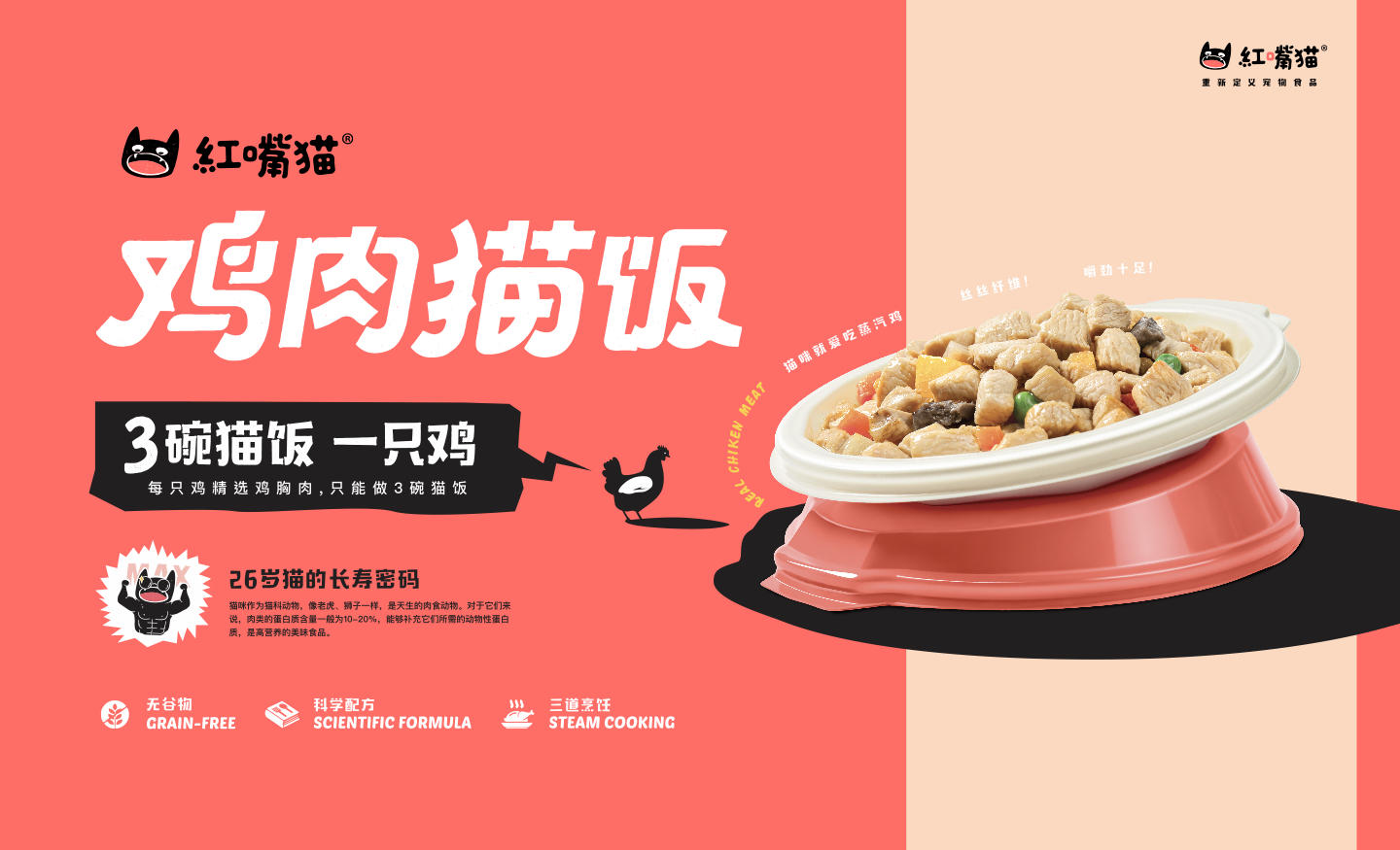 而在国内,“猫饭”作为一种全新的猫粮品类仍处于萌芽期,但业界也有一些新锐品牌正在涌现。我们关注到诸如红嘴猫® 这样的猫粮品牌,正在推出自主研发的“猫饭”食品,试图打破70年来⼈们对猫咪主⾷的固有认知,重新定义宠物⾷品。红嘴猫® 的“猫饭”联合了营养师、配方师、兽医等专家研制,以鸡胸肉粒为主要食材,在用量上主打“3碗猫饭一只鸡”,通过轻微蒸煮的烹饪方式来保留食材的营养成分和适口性。