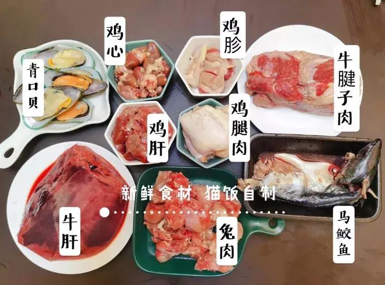 “猫饭”的食材往往以肉、动物内脏、海鱼为主,还会添加一些碳酸钙粉、牛磺酸粉、维生素等猫咪自身无法合成的营养元素。