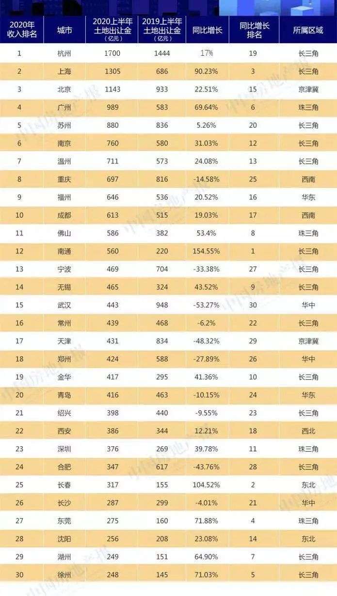 据统计,全国300城上半年出让土地总金额高达23716亿元,同比增长3%。第一的杭州半年卖地收入达1700亿元,比上年同期上涨17%。第二的上海收入达1305亿元,比上年同期上涨90.23%。而第三的北京收入达1143亿元,比上年同期上涨22.51%。