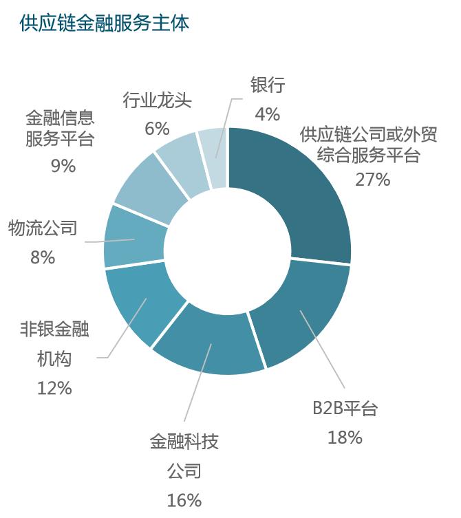 供应链金融行业的参与主体囊括了银行、行业龙头、供应链公司或外贸综合服务平台、B2B平台、物流公司、金融信息 服务平台、金融科技公司等各类企业。