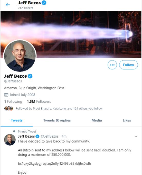 亚马逊创始人兼首席执行官杰夫·贝索斯的推特账号遭到黑客袭击