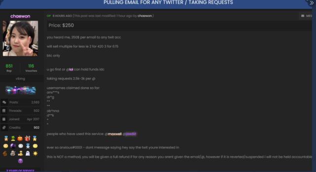 在周三推特遭受攻击之前的几天里,有迹象表明,SIM交换社区的某些人正在兜售更改与任何推特账户绑定的电子邮件地址的能力。一位名叫Chaewon的用户在OGuser(一个专门研究账户劫持的论坛)上发帖称,他们可以更改任何推特账户绑定的电子邮件地址,只需250美元,每个账户的直接访问费用在2000美元到3000美元之间。