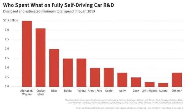 “烧钱榜”上排名前两位的是Waymo和通用Cruise,两家公司“烧钱”都超过30亿美元。第三名的Uber则“烧光”20亿美元。