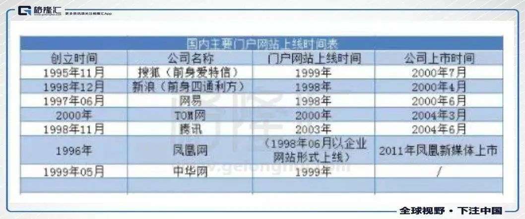 这一时期凭借全球互联网经济的火热发展,我国门户网站发展如火如荼。除前述三者之外,包括腾讯、凤凰网、中华网等企业也获得了巨大的流量与曝光。但好景不长,三大门户上市不久之后迎来了全球性的互联网经济泡沫,包括新浪、网易、搜狐、中华网在内的所有中国概念网络股都相继下跌。