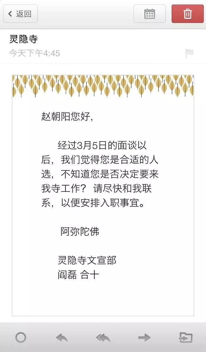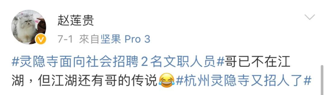 被我佛相中的赵莲贵,成功地从当年那次网红招聘中脱颖而出,并收到了灵隐寺发来的“佛系”offer。