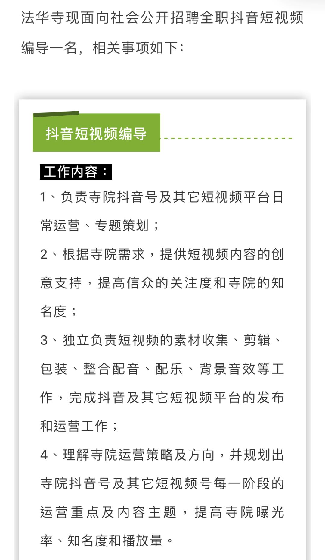 相比之下,浙江湖州法华寺招聘短视频编导时,在薪资待遇方面则显得十分“大方”。但实际上,与5位数薪资相对应的,是法华寺对招聘岗位并不算低的要求。
