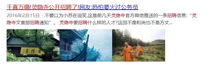 2016年正月初五,一则灵隐寺招聘新媒体文职的启事,火遍全国。由于引起过度关注,公众号的招聘推文发布仅两天,便被删除。