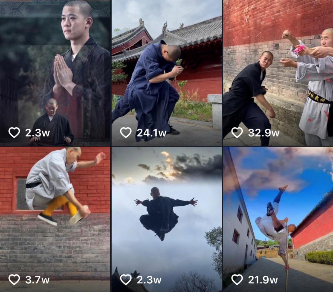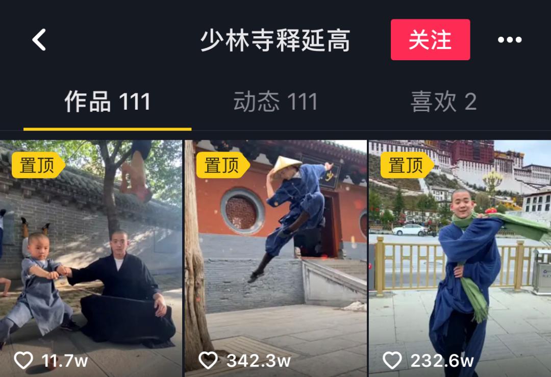 武僧释延淀、释延高、三宝等人组成的抖音“少林男团”,将少林武学、佛法与“晨钟暮鼓”的寺内生活,用抖音流行的音乐踩点、故事段子、剧情反转等方式,一一展示。