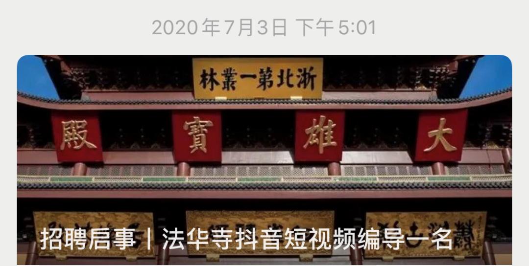无独有偶,7月3日,浙江湖州法华寺也面向全网,招聘抖音短视频编导,并给出朝九晚五、周末双休、月薪一万的福利待遇,一时间,羡煞旁人。
