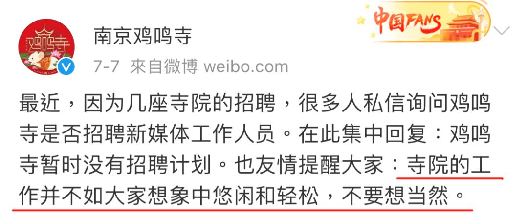 被网友在线询问多次是否招人的南京鸡鸣寺,在作出「最近无招聘计划」的声明时,同样也友情提醒了大家:寺院工作并不轻松,不要想当然。