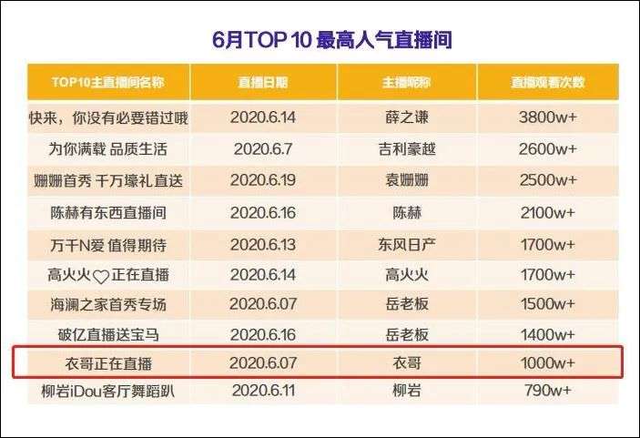 (在巨量算数发布的《2020年6月抖音直播消费报告》里,原本是秀场主播的衣哥不仅成为了优秀带货案例,还登上了6月Top10最高人气直播间的榜单。)