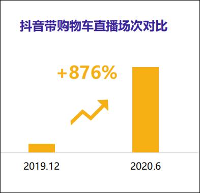 (在《2020年6月抖音直播消费报告》报告里,抖音平台上带购物车直播场次在2020年6月的数量,较2019年12月增长了876%,整整翻了8倍多。)