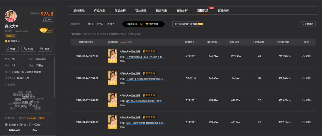 (根据数据网站新抖上能统计到的数据来看,高火火目前有4场电商直播带货,商品品涵盖3C数码、户外运动、家电、美妆护肤、食品饮料等品类商品均有涉猎。其中,4月一场、5月两场、6月三场,最高销售额为4月25日首秀场的8572万。5月份的两场带货直播销售额则在500万以下。)