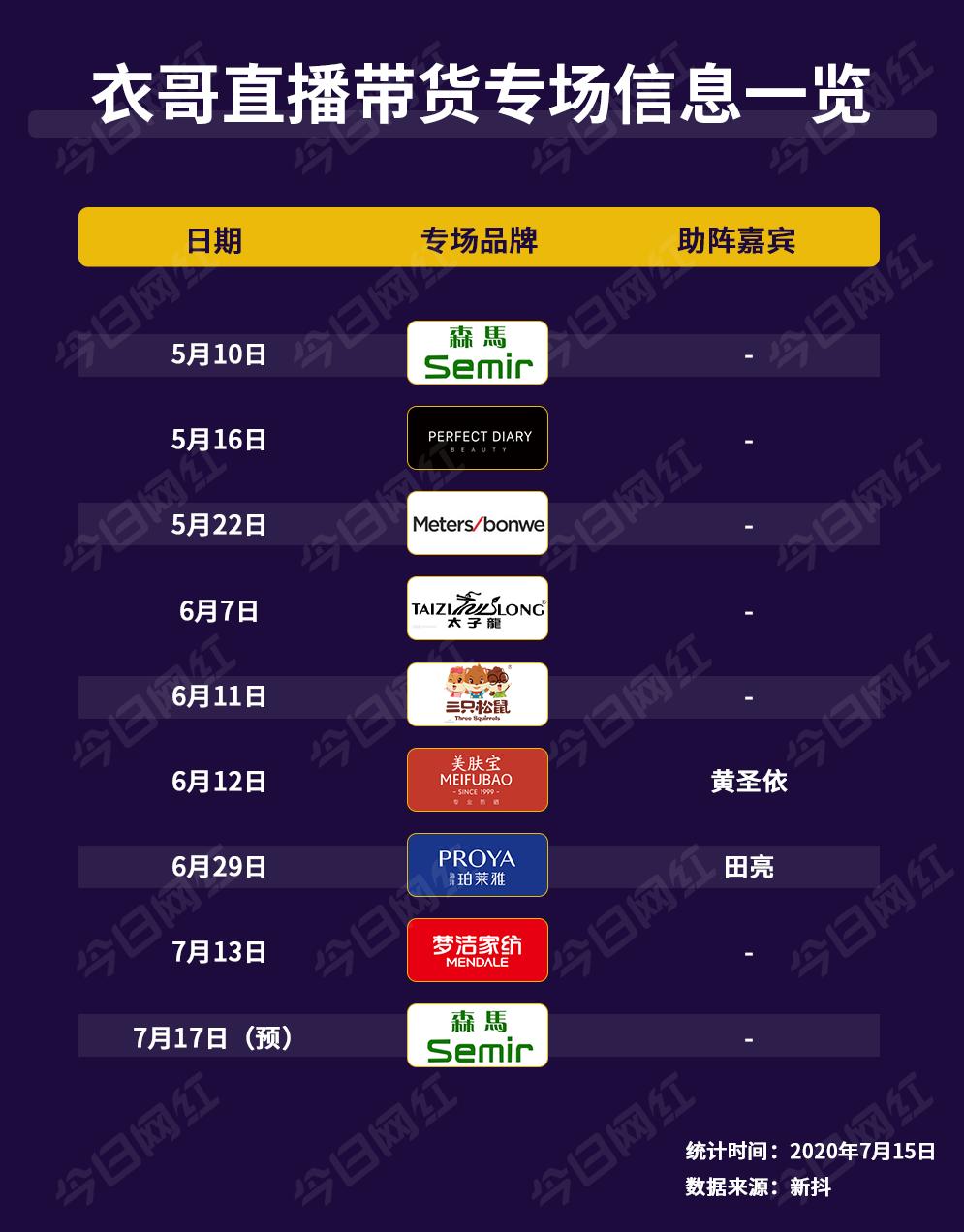 今日网红还对衣哥的品牌直播专场做了统计,目前的23场直播中,有8场品牌专场。其中两场还邀请到了黄圣依、田亮这些明星的加入。
