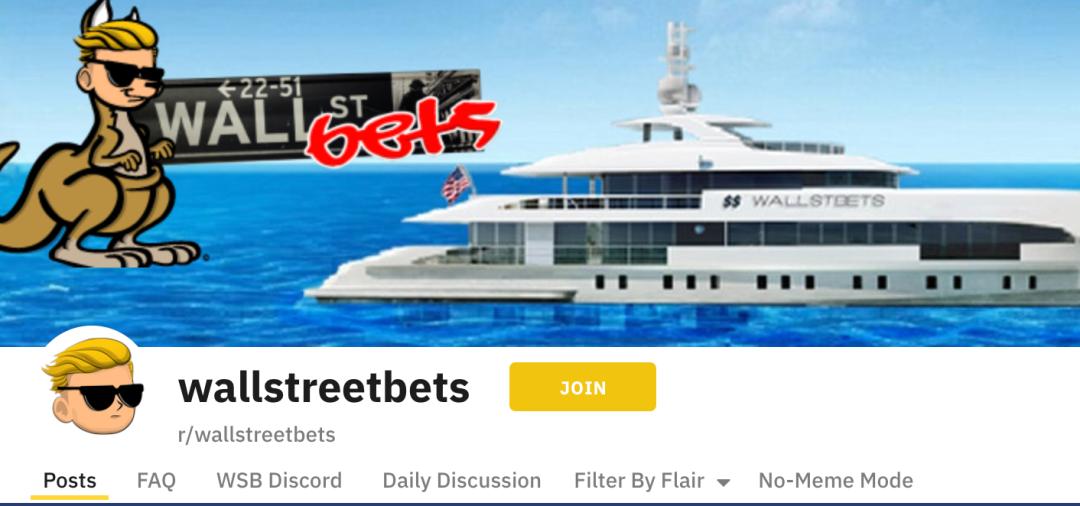 “押注华尔街”,是美国知名论坛Reddit上的一个交流讨论区,由罗宾汉的年轻小散们创立,目前已有130万成员,里面盛行着各种Z时代的段子和炒股直播贴。
