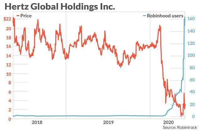 比如美国第二大租车公司赫兹租车,因业务低迷于5月末申请破产后,彻底沦为垃圾股,没想到超过16万罗宾汉用户就像为明星应援一样,疯狂抢购赫兹租车股票,4天内将市盈率拉高9倍,股价从0.56美元一路冲到5.54美元。