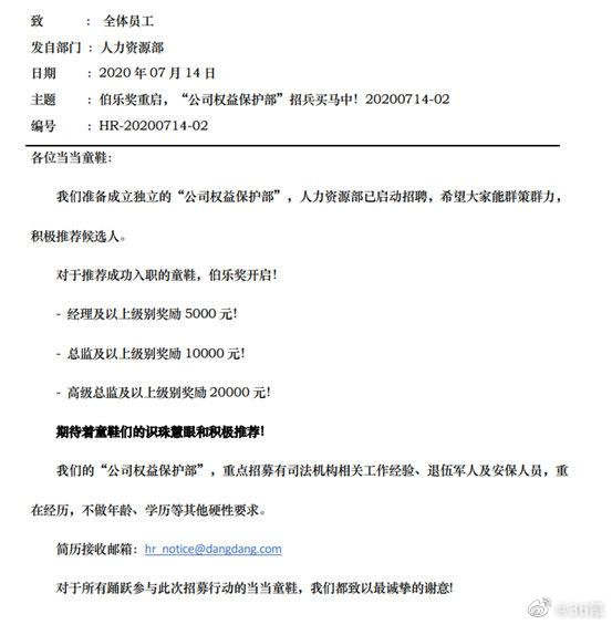 据当当网内部邮件显示,当当已经成立了独立的权益保护部,以防范李国庆行政拘留期满后扰乱公司正常工作秩序的可能。据悉,该部门将重点招募有司法机构相关工作经验、退伍军人及安保人员,重在经历,不做年龄、学历等其他硬性要求。推荐入职还会给员工奖励。