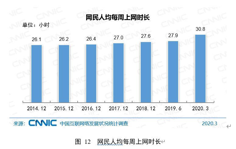 中国互联网络信息中心发布的第45次《中国互联网络发展状况统计报告》显示,截至2020年3月,我国网民人均每周上网时长为30.8小时,即日均上网时长约4.4小时。截至2020年3月,我国手机网民规模打8.97亿,较2018年底增长7992万,我国网民使用手机上网的比例达99.3%,较2018年提升0.7个百分点。