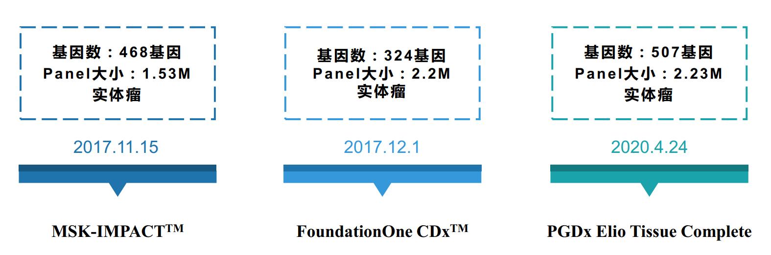 根据大Panel必须有效、准确的满足临床上的需求,才能获得各国医药主管部门的认可。截至目前,全球只有美国FDA批准了三个大Panel测序品种上市,分别是Foundation One CDx、MSK-IMPACT,以及PGDx Elio Tissue Complete,基因数量从300到500不等,Panel大小从1.5M到2.2M不等。