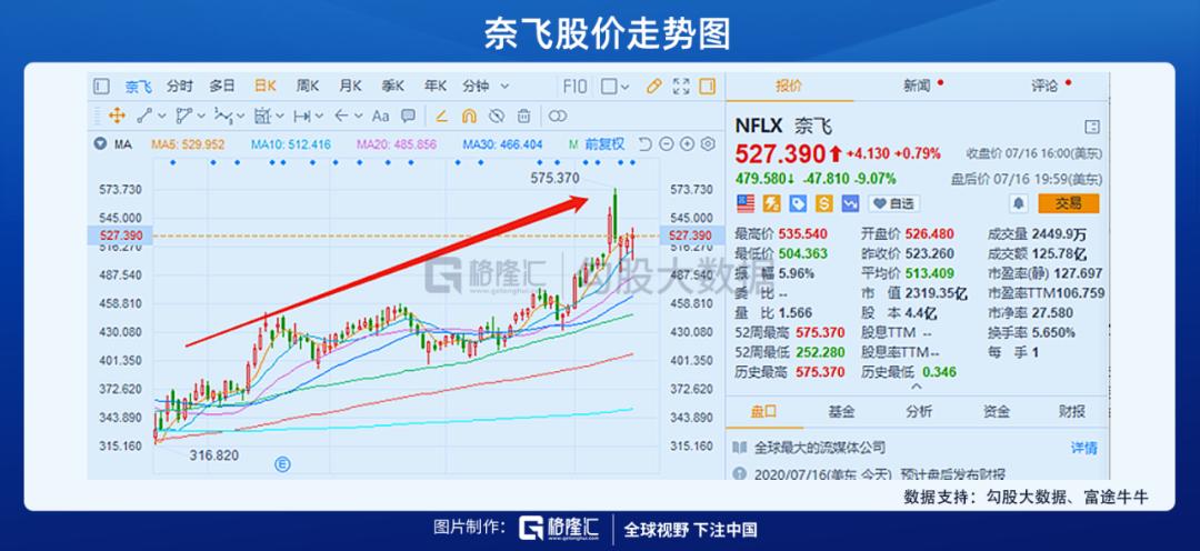 在这个美国疫情影响最大的季度,市场给予奈飞非常高的期待。随着美国疫情二次爆发,高盛在7月10日的报告中把奈飞的目标价上调到670美元,有30%的增长空间,当天奈飞股价大涨8%,第二天直接打到历史新高的575美元。