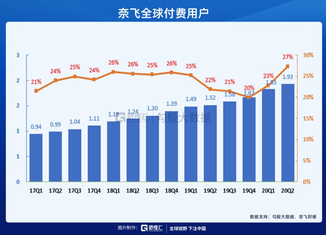 受全球疫情影响,大部分人处于家居隔离状态,宅家最好的娱乐消遣就是煲剧看电影,奈飞是最好的选择,奈飞Q1付费用户暴增1577万,二季度1009万,上半年加起来一共增长了接近2600万,比2019年全年还要多。