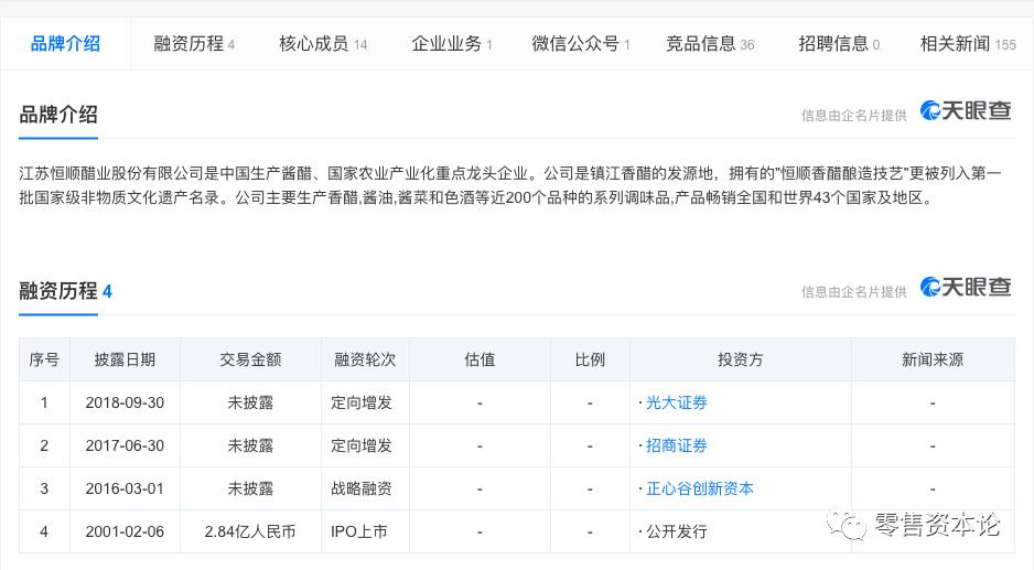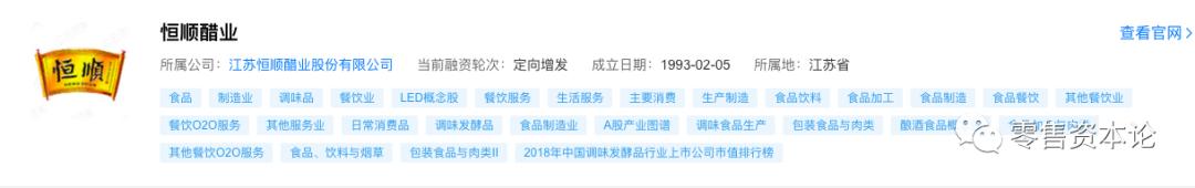 天眼查数据显示,江苏恒顺醋业股份有限公司是中国生产酱醋、国家农业产业化重点龙头企业。