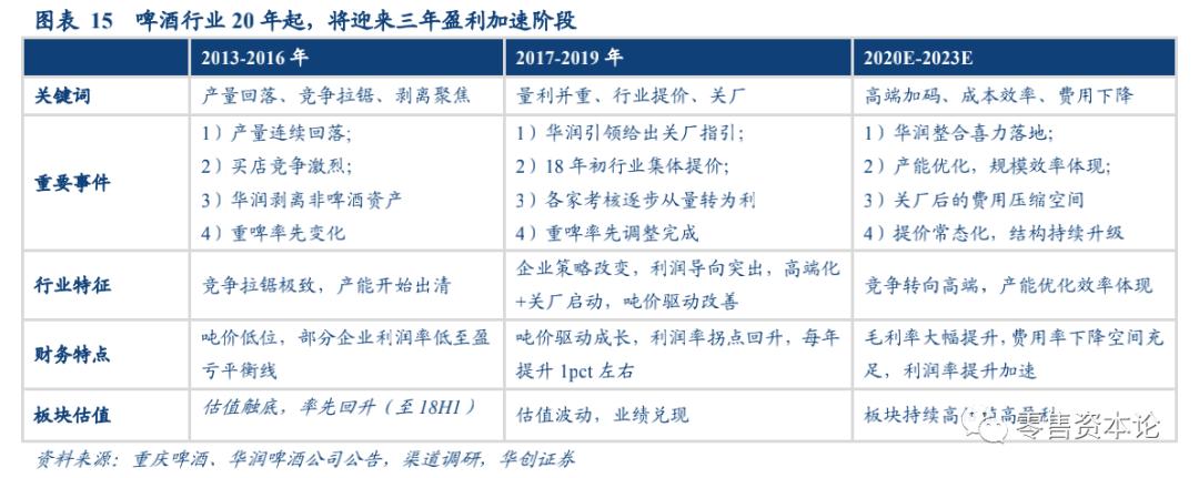 自20 年起,产能优化带来成本效率提升、费用下降潜力刚刚开始体现,加上高端化持续推进,内资龙头企业为代表的行业利润率有望加速提升,迈入三年确定性盈利加速阶段。