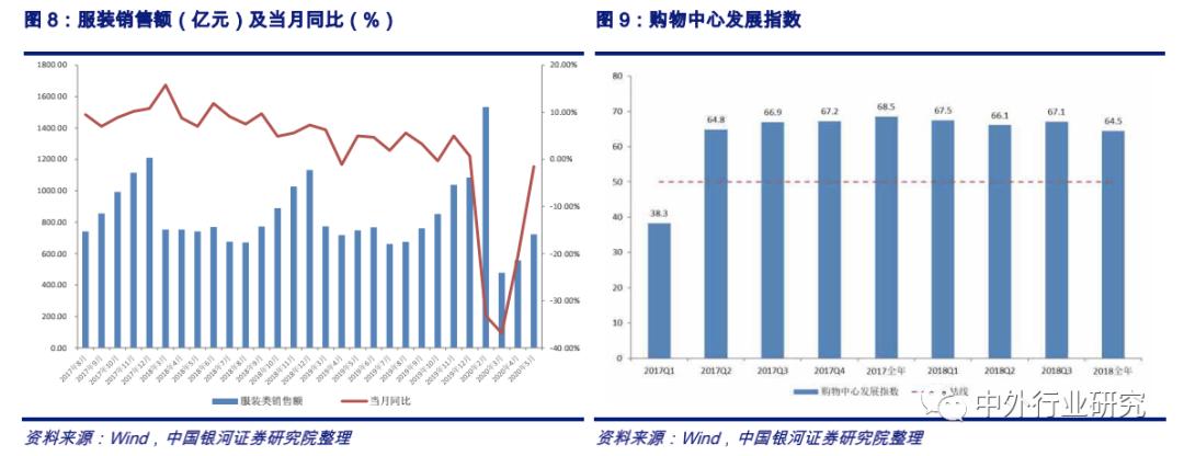 从产品品类来看,服装鞋帽销售额单月同比下滑0.6%,较上年同期滑落 4.7 个百分点,环比上月进一步大幅改善 17.9 个百分点,1-5 月份累计跌幅收窄 5.5 个百分点至 23.5%,在各品类之中累计表现排名倒数第二;
