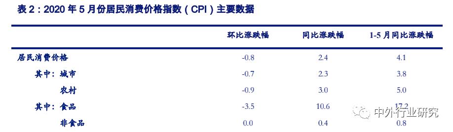 5月CPI同比增速较上月的3.3%滑落0.9个百分点至2.4%,已恢复至2018下半年至2019年初的水平;