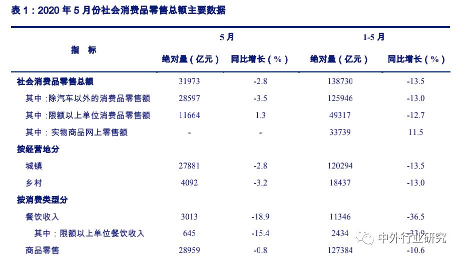 2020 年 5 月份社会消费品零售总额 3.19 万亿元,同比名义下滑 2.8%(扣除价格因素实际下滑 3.7%)。