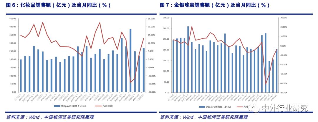 可选消费:5 月各类可选品单月增速均出现环比大幅改善,化妆品类已恢复至前期的高位增速水平