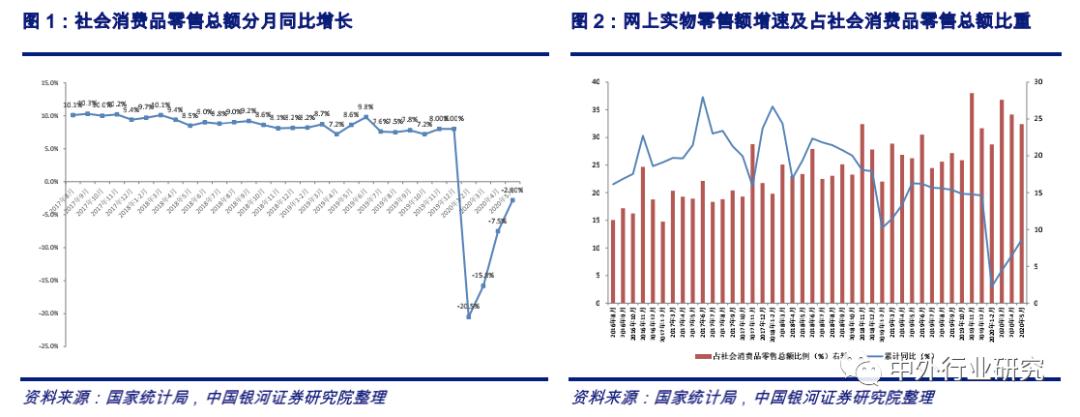 受疫情催化渗透率得以提升的线上渠道表现同样优异,2020 年前 5 月实物商品网上零售额为 3.37 万亿元,同比增长 11.5%,占社会消费品零售总额的比重为 24.3%,份额占比进一步提升。