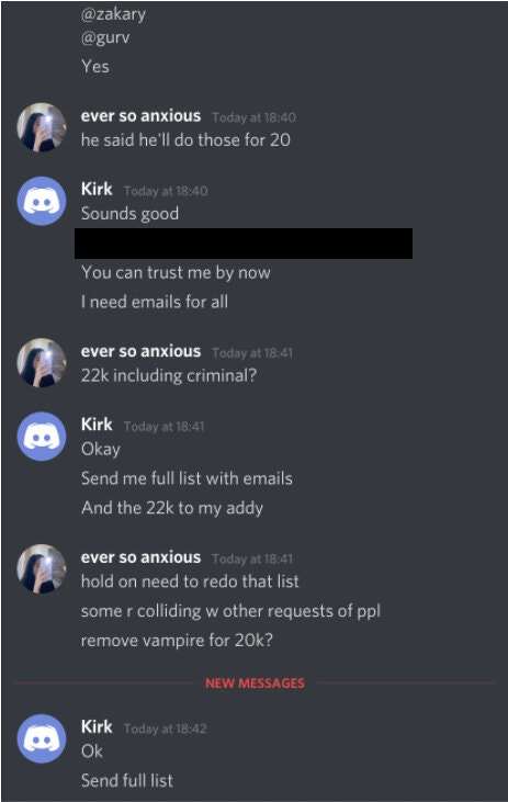 Kirk分别在周二晚上和周三早上跟lol与ever so anxious取得了联系,问他们是否想成为其中间人,在他们有一定名气的在线地下市场去出售盗来的推特账号。作为中间人,他们也可以从每笔交易中抽成。